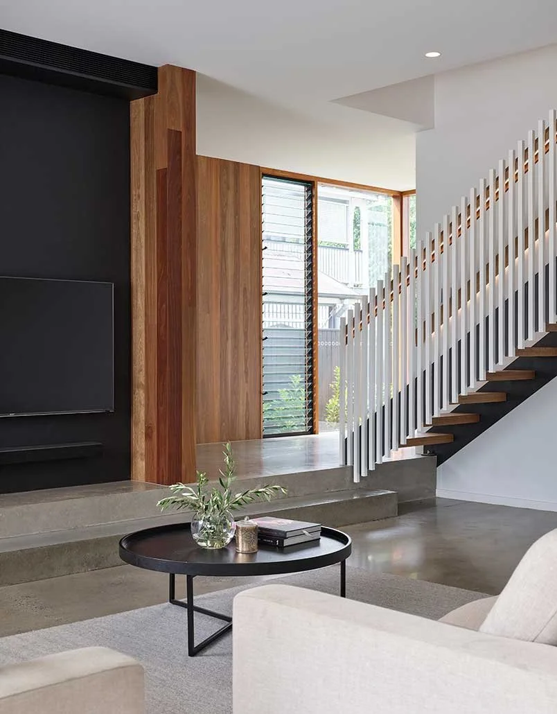 The front entryway features select grade spotted gum timber externally and creates a inviting welcome while hinting at an imposing off form concrete wall. Internally, timber feature pieces are complemented by burnished concrete floors and charcoal cabinetry throughout the downstairs living and dining areas.
