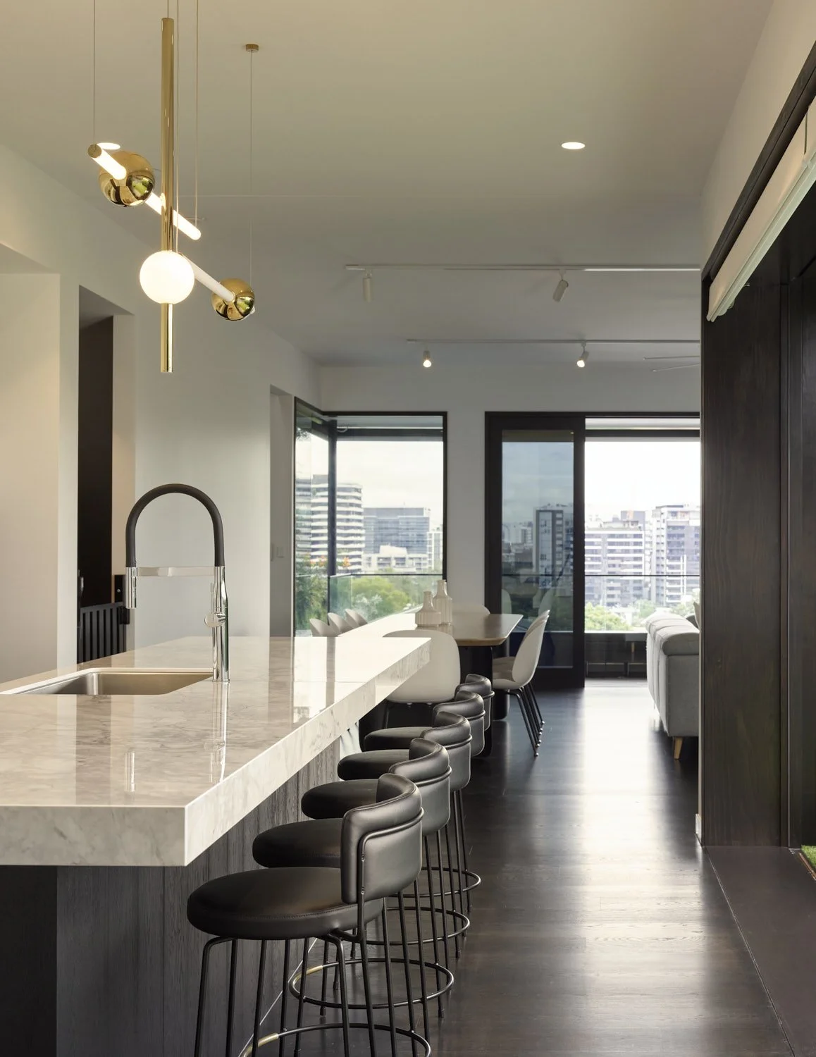 This family home, designed for two adults and five children, provides space for both living and working. It includes a spacious office and a nanny's area at the bottom level, ensuring a comfortable and self-contained environment. The main bedroom opens up to a rooftop terrace, granting a breathtaking view of the city.
